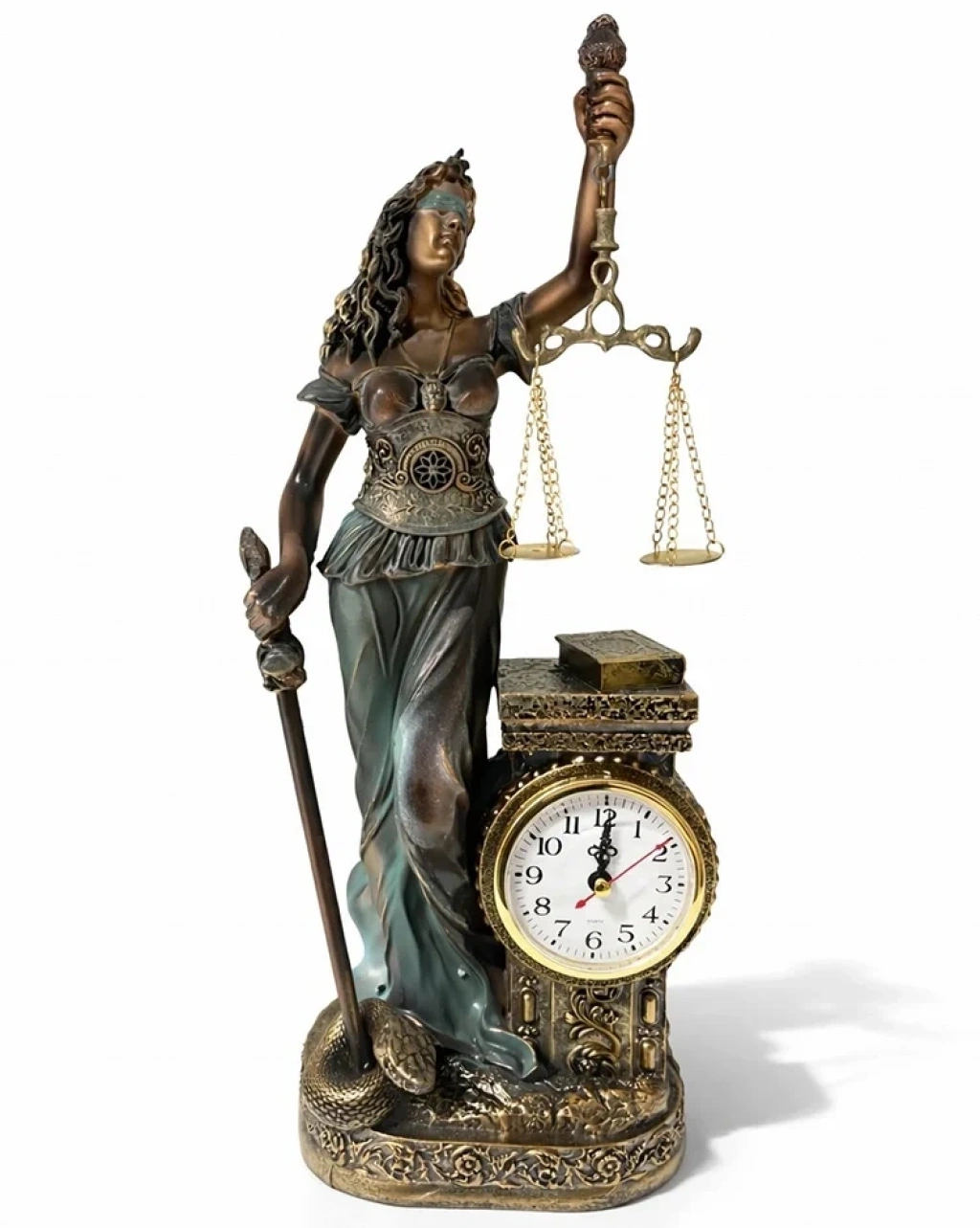 44X17 CM POLYESTER SAATLİ ADALET FİGÜRÜ Ürün ÖzellikleriPolyester Saatli Adalet Figürü, klasik adalet sembolünü büyük ve gösterişli formuyla dekoratif bir saat tasarımıyla birleştiren dikkat çekici bir masa ve vitrin aksesuarıdır. 44x17 cm ölçüsündeki yüksek ve etkileyici yapısı sayesinde ofis, hukuk bürosu ve kurumsal çalışma alanlarında güçlü bir görsel etki oluşturur. Elinde terazi tutan adalet figürü detayı ile belirgin bir adalet sembolü vurgusu sunarken, alt bölümde yer alan saat kısmı ürüne işlevsel bir özellik kazandırır. Hem dekoratif hem kullanışlı tasarımı sayesinde masa üstü, makam odası ve kitaplık alanlarında prestijli bir duruş sergiler. Dayanıklı polyester malzeme yapısı sayesinde uzun süre formunu korur ve bulunduğu ortama şık bir ofis dekor ürünü kimliği kazandırır. Özellikle avukat ofisleri ve hukuk temalı çalışma alanları için anlamlı ve dikkat çekici bir hediye alternatifi olarak tercih edilebilir.Ürün Teknik Özellikleri Özellik Açıklama Ürün Adı Polyester Saatli Adalet Figürü 44x17 Cm Malzeme Polyester Ölçü 44 x 17 cm Tasarım Adalet figürü ve entegre masa saati Kullanım Alanı Ofis, hukuk bürosu, makam odası, masa üstü dekorasyon Paket İçeriği1 adet Polyester Saatli Adalet Figürü (44x17 cm)