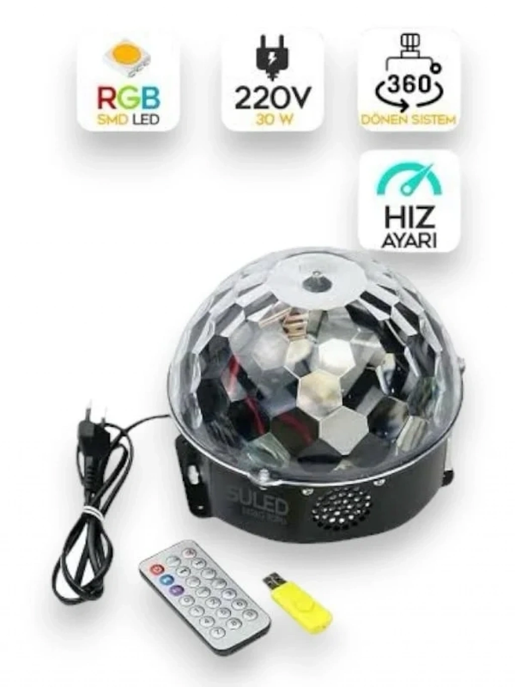 Sese Duyarlı Disko TopuSD Kart ve USB Girişli LED Disko Işıklı Speaker Hoparlör (Kumandalı)Müzik dinlemek hiç bu kadar eğlenceli olmamıştı.Odanızda müzik dinlerken ortama harika bir görsel şölen yaşatmaya ne dersiniz ?Partilerinizde ve kutlamalarınızda SD Kart ve USB Girişli LED Işıklı Kristal Yarım Küre var ise başka bir şeye ihtiyacıınz yoktur.SD Kart ve USB Girişli LED Işıklı Kristal Yarım Küre ile kırmızı, mavi ve yeşil olmak üzere 3 farklı renk kombinasyonu müzik ritmine ayak uyduruyor.SD kart veya USB Bellek desteğiyle istediğiniz şarkıyı SD Kart yada USB Belleğinize yükleyin ve kumanda sayesinde yada üzerinde yer alan tuşları sayesinde müziği başlatın.Müziğin ritmine göre içerisinde yer alan led lambalar hareketli olarak yanıp sönmeye başlayacaktır.Ürünü prize ilk taktığınızda sadece dönerek led ışık saçacaktır.Dahili hoparlör, iyi bir ses kalitesi Bulunduğu ortamı aydınlatan güçlü LED ışık Tak çalıştır sistemiyle prize taktığınız andan itibaren ürünü kolaylıkla çalıştırabilirsiniz.Uzaktan kumanda ile ses kontrolü ve müzikler arası geçiş rahatlıkla sağlanabilir.1,5 Kg ağırlığındadır.Paket içerisinden çıkan Hediye USB Bellek 128 MB hafızaya sahiptir.USB Bellek içerisinde toplam 17 adet deneme amaçlı müzik yüklüdür.İsterseniz USB Belleği bilgisayarınıza takıp içindeki müzikleri silip,yükleyebilirsiniz.