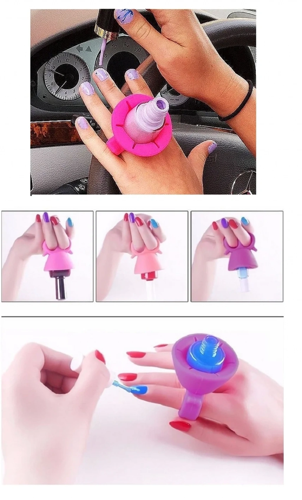 İki parmağınıza yüzük takar gibi oturtuyorsunuz ve oje şişenizi tutucunuzun ortasına yerleştirerek ojenizi sürüyorsunuz