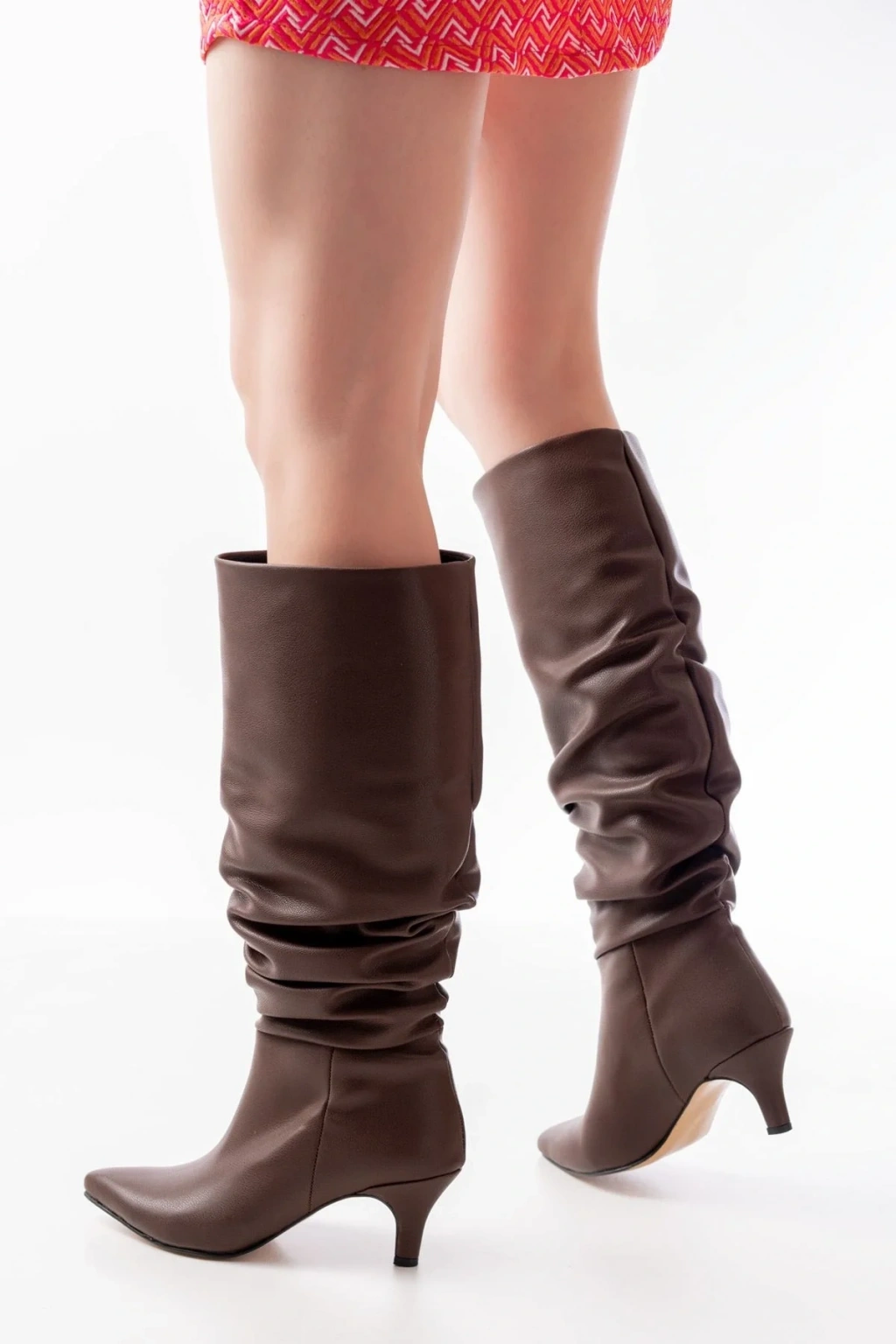 USLUCAN ALIŞVERİŞ LS-226 Kahve Kırışık Rugan Fermuarlı Lastikli İnce Yüksek Topuklu Kadın Çizme
