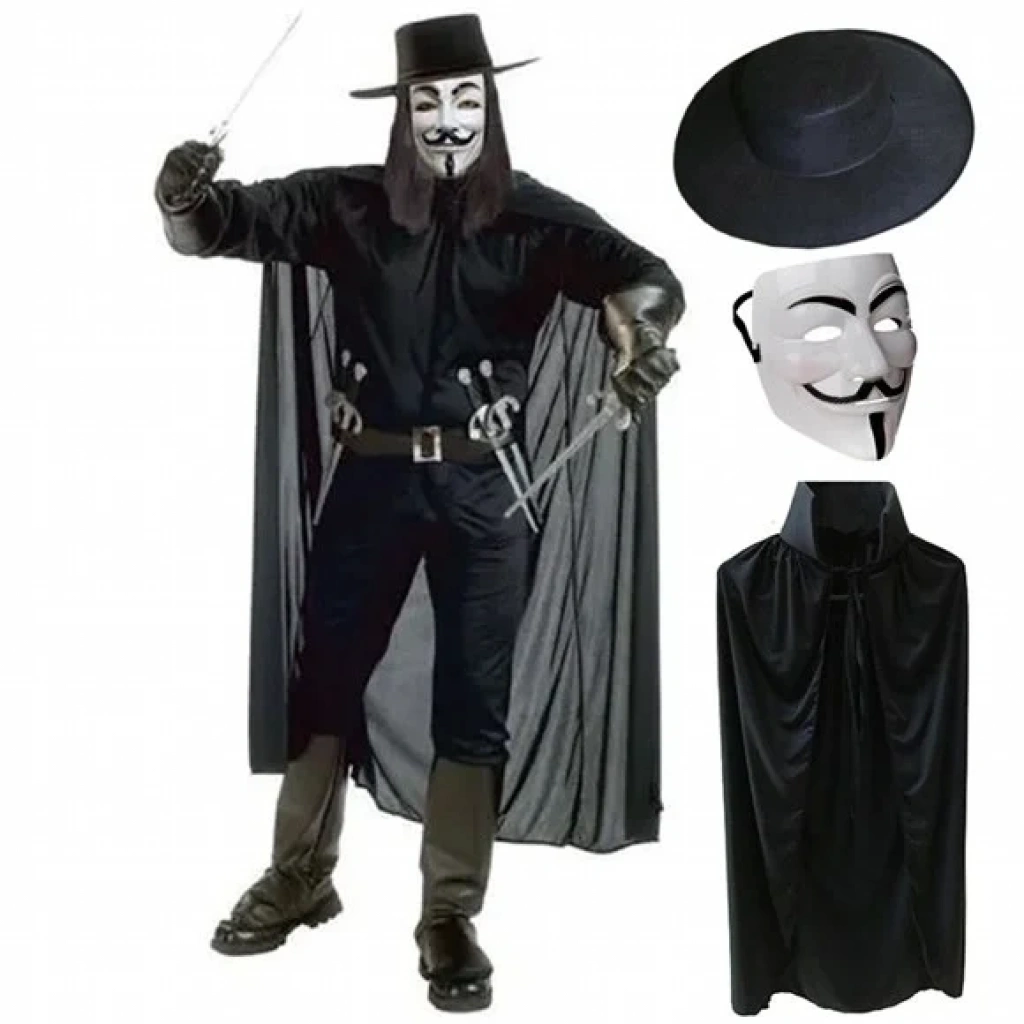 V FOR VENDETTA MASKESİ ŞAPKA PELERİN SETİÜrün ÖzellikleriMaske: Yüksek kaliteli plastik malzeme, hafif ve rahat kullanım.Şapka: Şık tasarımlı siyah şapka, dayanıklı kumaştan üretilmiştir.Pelerin: Siyah, uzun pelerin, kaliteli kumaş yapısı ile dikkat çeker.Film, tiyatro ve kostüm partileri için idealdir.Unisex tasarım, hem yetişkinler hem de gençler için uygun.Paket İçeriği1 adet V For Vendetta Maskesi1 adet Siyah Şapka1 adet Siyah Pelerin