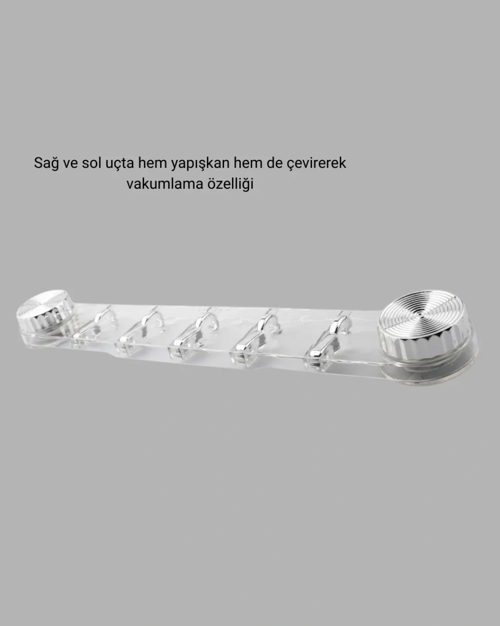 Vakumlu ve yapışkanlı askı aparatı, mutfak ve banyo alanlarında düzeni kolayca sağlamak için tasarlanmıştır. Beş askı bölmesi sayesinde farklı eşyaları bir arada ve düzenli şekilde asmanıza yardımcı olur. Günlük kullanımda sık ihtiyaç duyulan ürünlerin pratik şekilde organize edilmesini sağlar.Sağ ve sol uçlarda bulunan vakumlu sistem, yüzeye çevirerek sabitleme imkânı sunar. Yapışkanlı destek, askılığın sağlam durmasına katkı sağlar. Fayans, cam ve parlak yüzeylerde güçlü tutunma sağlayarak güvenli kullanım sunar. Alet gerektirmeyen montaj yapısı, ürünü kısa sürede kullanıma hazır hale getirir.Şeffaf orta bölüm, modern ve sade bir görünüm kazandırır. Bu tasarım, ürünü hem mutfak hem de banyo dekorasyonuna uyumlu hale getirir. Suya ve buhara dayanıklı yapısı sayesinde nemli ortamlarda uzun süreli kullanım için uygundur.Askılık, alan tasarrufu sağlayarak yaşam alanlarını daha düzenli hale getirir. Havlu, lif, mutfak bezleri ve küçük aksesuarlar için ideal bir çözümdür. Vakumlu ve yapışkanlı mutfak banyo askılığı, pratik kurulumu, dayanıklı yapısı ve çok yönlü kullanımı ile ev düzenini destekleyen fonksiyonel bir üründür.